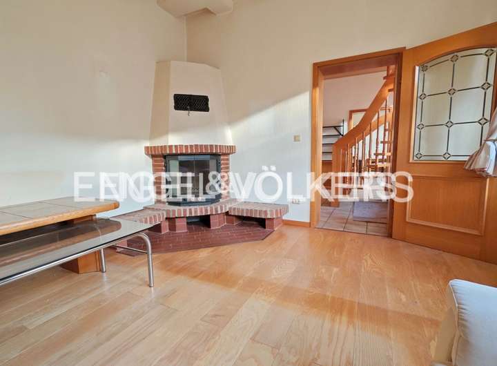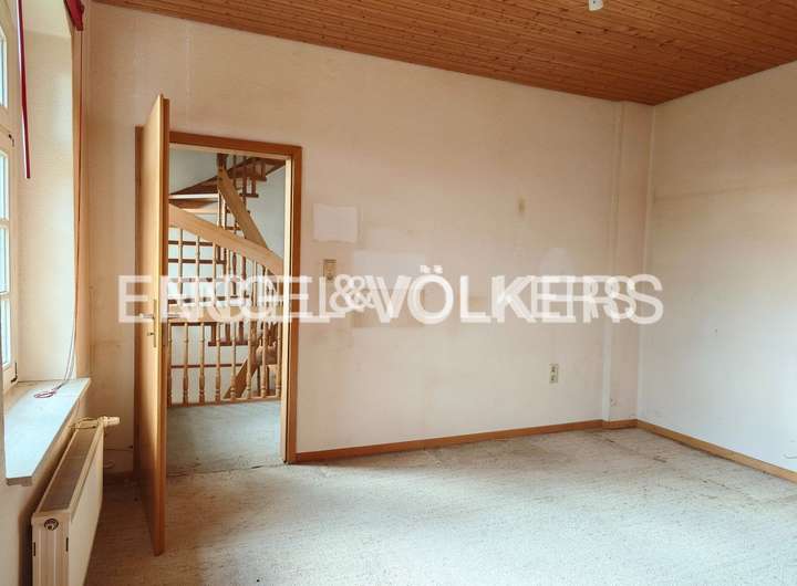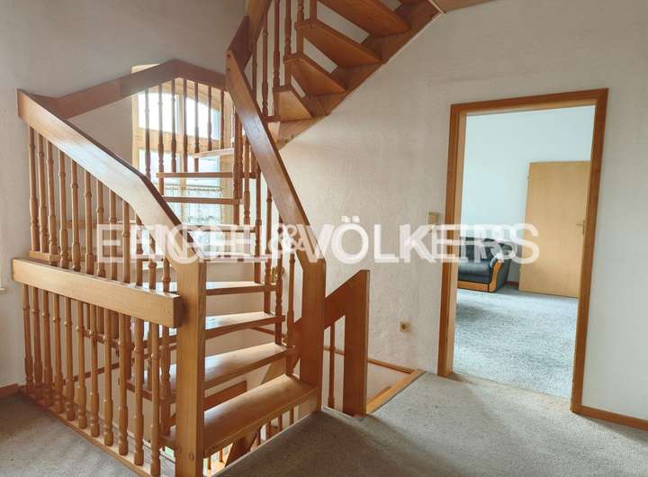 Auf dem kompakten Grundstück von 370 m² erstreckt sich die Gesamtfläche von ca. 269 m², die sich über zwei Etagen sowie ein Dachgeschoss verteilen, dass noch zusätzliches Ausbaupotential darstellt. Die Immobilie verfügt über insgesamt 8 Zimmer und 2 Badezimmer, was vielseitige Nutzungsmöglichkeiten bietet – sowohl für die große Familie als auch für Liebhaber von Raum und Freiheit. Ein gemütlicher Kamin im Wohnzimmer im Erdgeschoss sorgt für eine behagliche Atmosphäre an kalten Wintertagen. Die im Flur befindliche Vollholztreppe verbindet die Etagen und unterstreicht den traditionellen Charakter des Hauses.