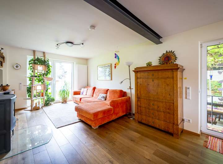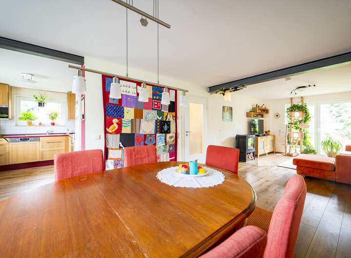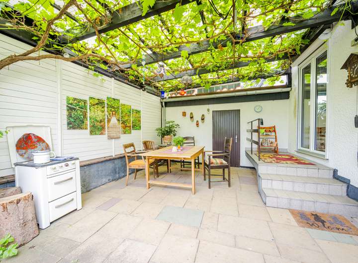 Von hier aus haben Sie Zugang zur einladenden, teilweise überdachten, Sonnenterrasse und den Garten und können die Natur in vollen Zügen genießen.