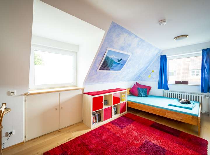 Das Kinderzimmer verfügt über zwei Fenster und ist hell und geräumig.