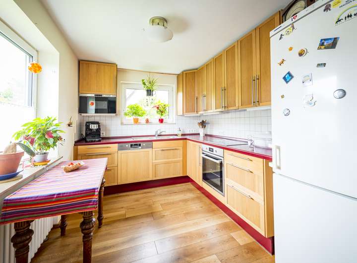 Die offene Küche mit zwei weiteren Fenstern zweigt vom Wohn/Essbereich ab und bietet Platz für eine moderne Einbauküche.