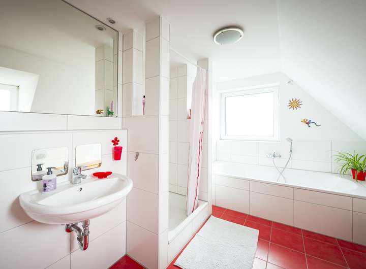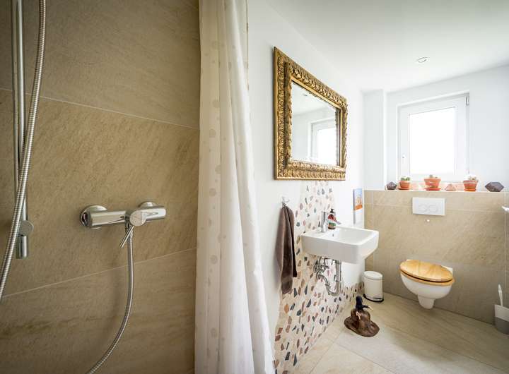 Von dort aus erreichen Sie das erste Badezimmer mit Außenfenster und ebenerdiger Dusche.