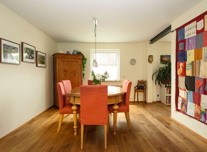 Geradeaus kommen Sie in den großzügigen, offenen und lichtdurchfluteten Wohn-/Essbereich mit Eichenholzfußboden, der mit seinen großen, bodentiefen Fenstern einen traumhaften Blick in Ihren großzügigen Garten bietet. Im Winter können Sie hier abends vor dem gemütlichen Kamin sitzen.