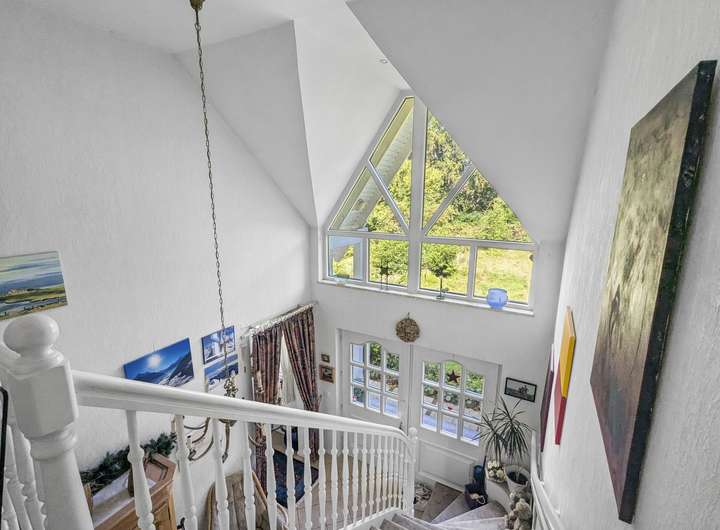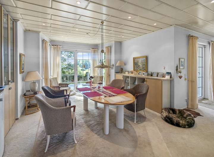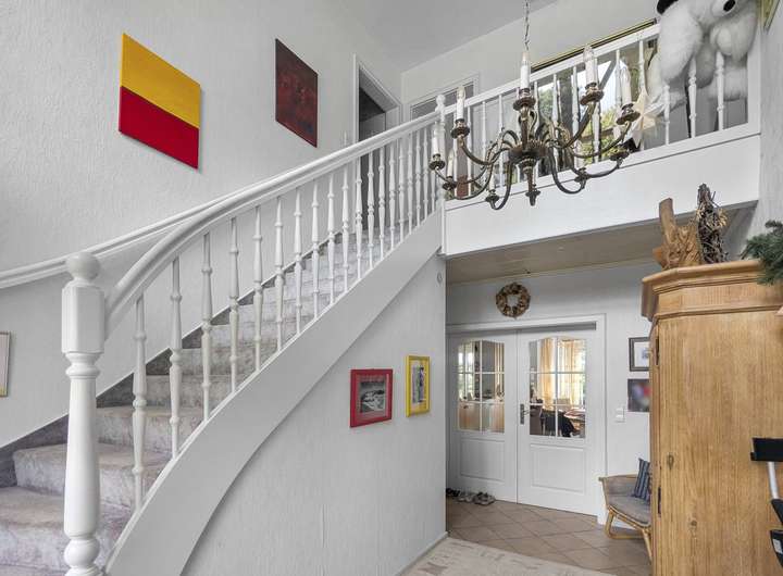 Zeitlose Architektur mit durchdachter Raumaufteilung Helle, freundliche Räume durch große Fensterflächen Flexible Nutzungsmöglichkeiten Terrasse, Balkon und gepflegtes Grundstück Fußbodenheizung Massive Doppelgarage Harzerdach Kamin Vollunterkellert