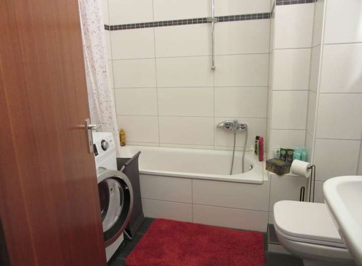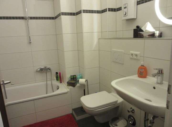 - Badezimmer (neu in 2018): WC, HWB, BW, verschiedene Höhen gefliest (Fliesen in weiss mit Bordüre), Bodenfliesen in anthrazit, WM-Anschluss