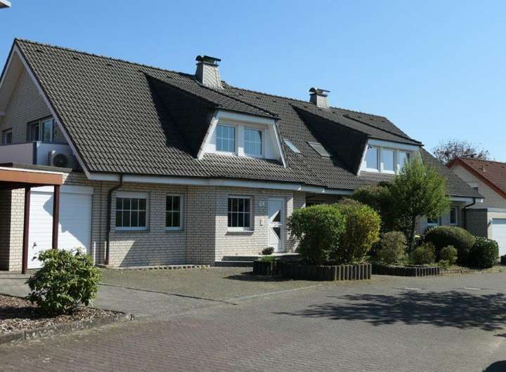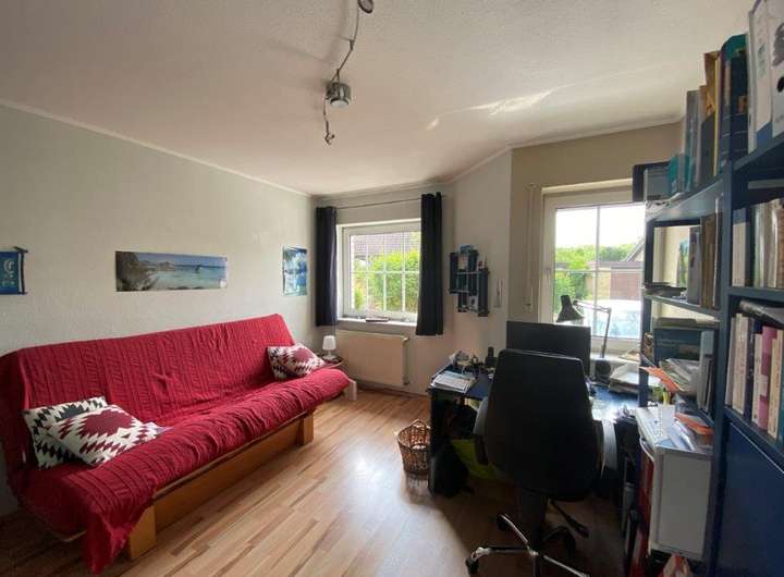 Im Erdgeschoss der Doppelhaushälfte befindet sich eine Dreizimmer- Wohnung mit ca. 80,08 m². Zu der Erdgeschosswohnung gehört eine mit ca. 25qm überdimensionierte Garage (Platz für Fahräder, Motorrad oder Gartenmöbel) und ein großer im Sommer blickgeschützter Garten.