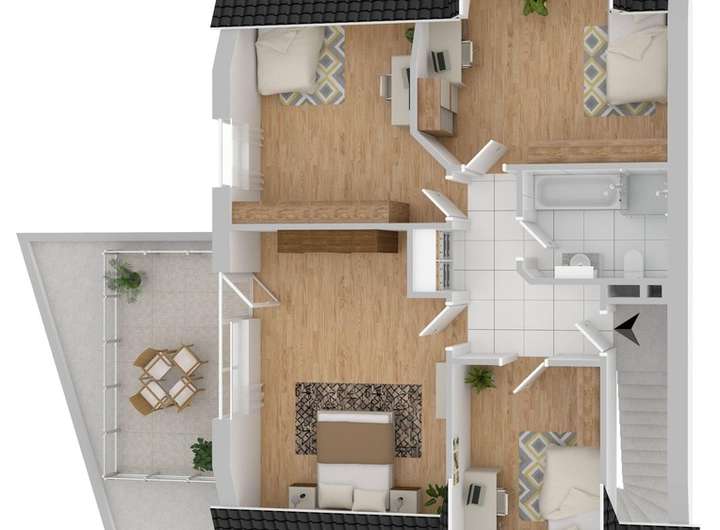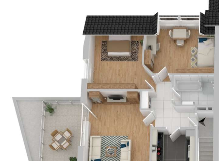Im Dachgeschoss befindet sich ist eine ca.78 m² große Dreizimmer-Wohnung mit Dachterrasse und Klimaanlage im Wohnzimmer. Das Badezimmer ist mit einer Dusche, einer Badewanne und einem Waschbecken ausgestattet. Der teilweise begehbare Dachboden kann für die Lagerung von Gegenständen genutzt werden.