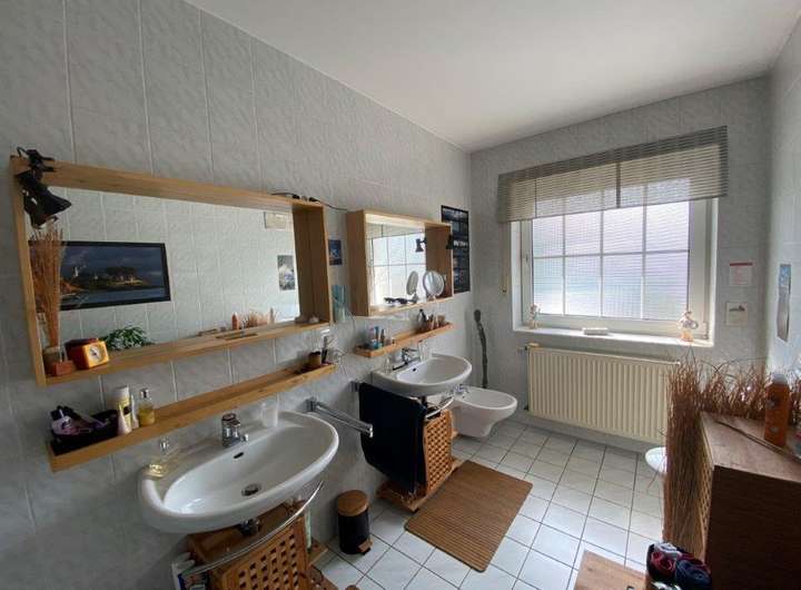 Das Badezimmer ist mit einer Dusche, einer Badewanne, Bidet und zwei Waschbecken ausgestattet.