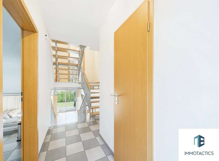 Ein halbes Geschoss höher warten zwei gut geschnittene Zimmer, die je nach Bedarf als Kinderzimmer, Büro oder Gästezimmer genutzt werden können. Durch die versetzte Bauweise profitieren die Räume von einer angenehmen Aufteilung und wirken besonders hell und gut möblierbar – perfekt für wachsende Bedürfnisse.