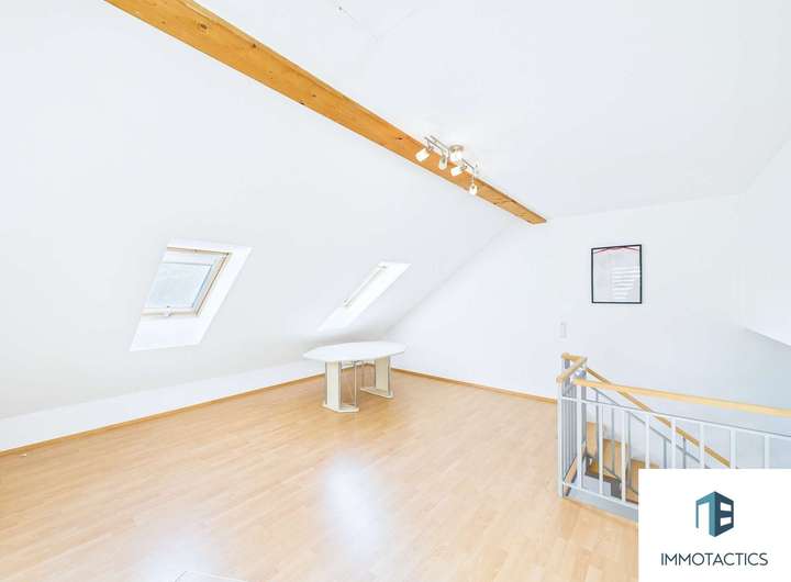 Im obersten Geschoss liegt ein über 30 m² großer, offener Raum (Studio), der vielfältig nutzbar ist: als Jugendzimmer, Spielbereich, Kreativraum oder ruhiger Rückzugsort. Die sichtbaren Holzbalken und das Tageslicht sorgen für ein wohnliches Ambiente. Zusätzlicher Stauraum steht über den Dachboden zur Verfügung.