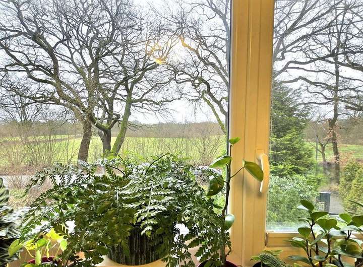 - weitläufige Felder auf der gegenüberliegenden Straßenseite mit Blick ins Grüne