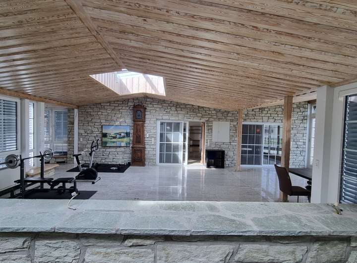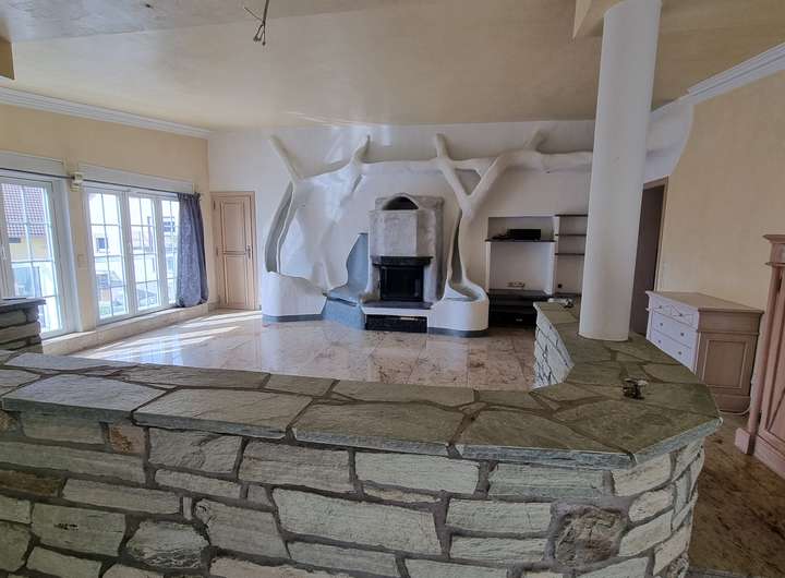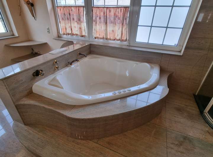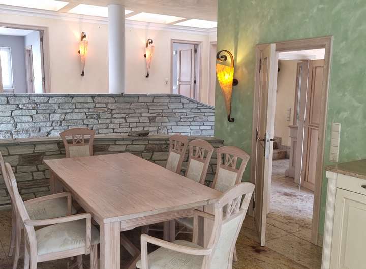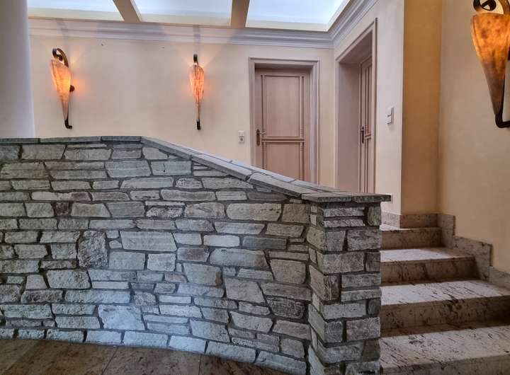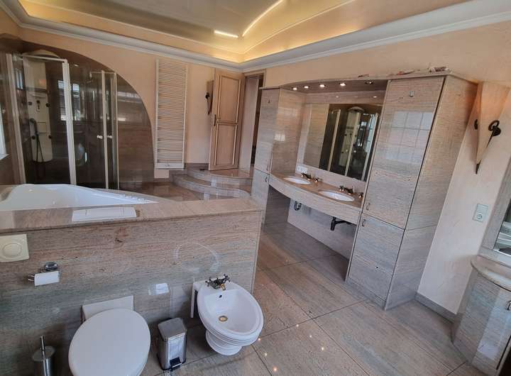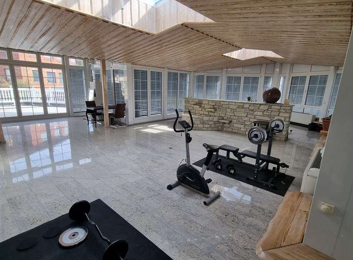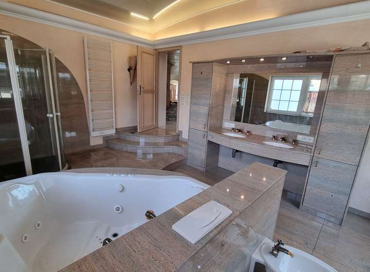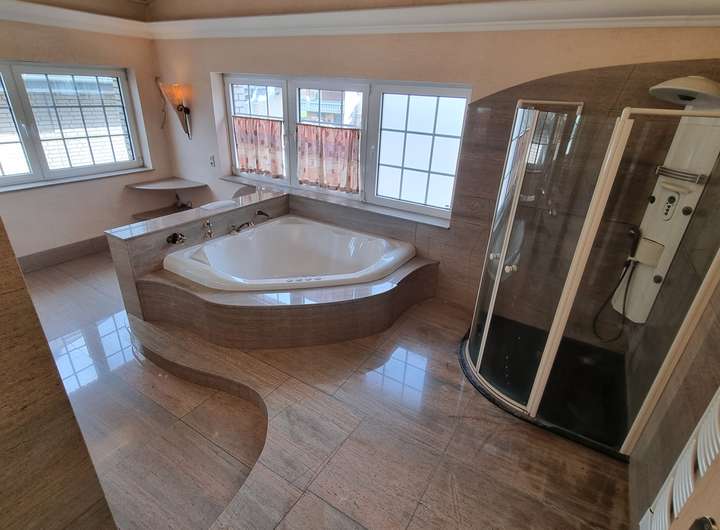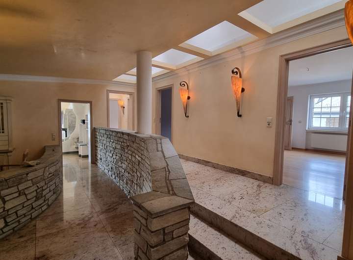 Luxuriös, Mamor, Granit, Xxl Wintergarten, Bad mit großer Badewanne und Dusche sowie Doppelwaschtisch, hochwertige Einbauküche mit E-Geräten, Wohnzimmer mit Kaminofen und beleuchteten Wasserspielen, Gäste Bad, 4 Schlafzimmer, Balkon