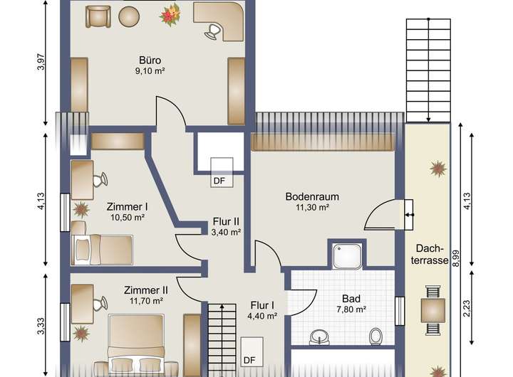 Entspannen Sie auf der großzügigen Dachterrasse über der Garage oder genießen Sie entspannte Stunden auf der überdachten Außenterrasse mit Markise – ideal ausgerichtet nach Süd/West.