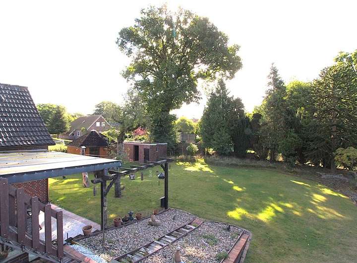 Der liebevoll gestaltete Garten mit altem Baumbestand und diversen Büschen und Stauden bietet eine grüne Oase und kann mit der eigenen Hauswasserpumpe kostengünstig bewässert werden.