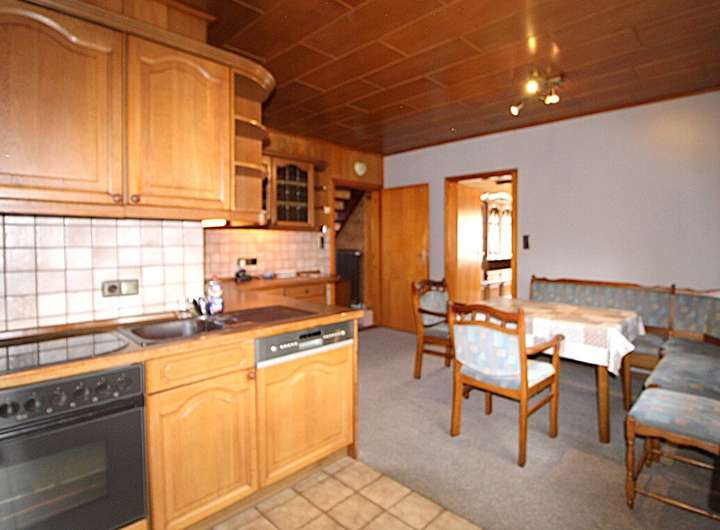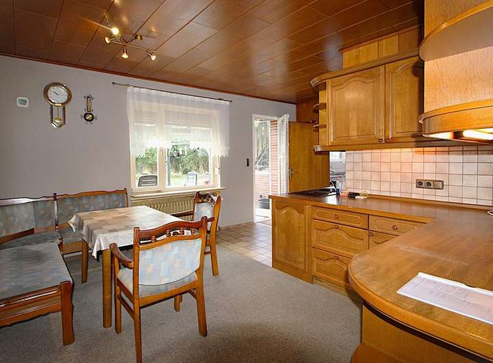 eine Küche mit Sitzecke (Zugang zur Terrasse)