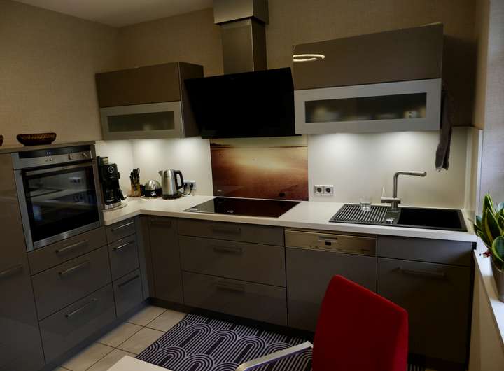 Von hier führt ein kleiner Zwischenflur direkt in die moderne Küche, den Hauswirtschaftsraum und einen praktischen Abstellraum – kurze Wege, die den Alltag angenehm erleichtern. Auch die große Garage mit integrierter Werkstatt (ca. 55 m²) ist direkt zugänglich.