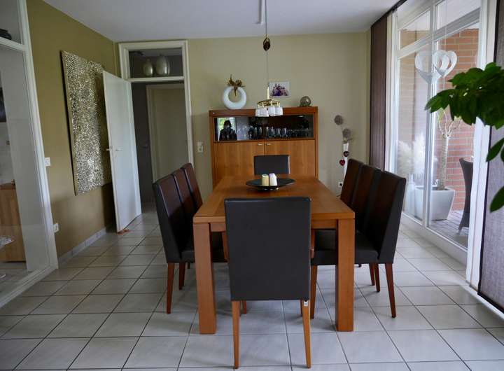 Im Wohnzimmer erwarten Sie zwei charmante Erker, die den Raum elegant gliedern und ein offener Kamin, der am Abend für gemütliche Stunden sorgt. Das anschließende Esszimmer bietet durch seine großen Fenster und den direkten Zugang zur Terrasse den perfekten Rahmen für gesellige Treffen mit Familie und Freunden.