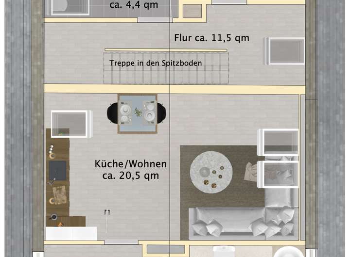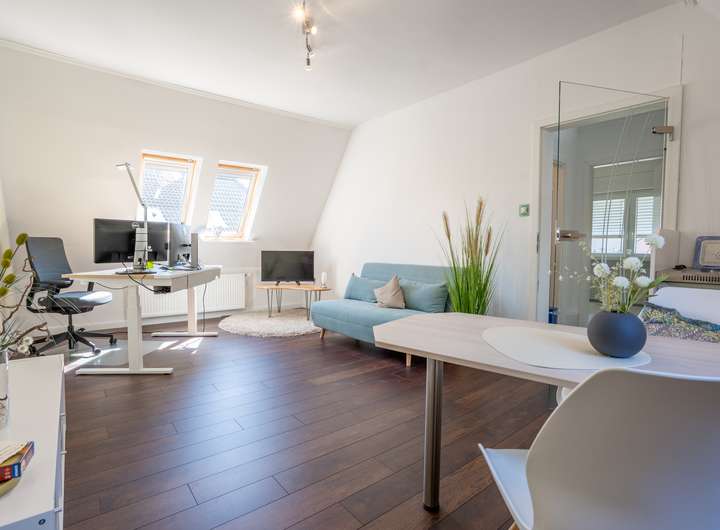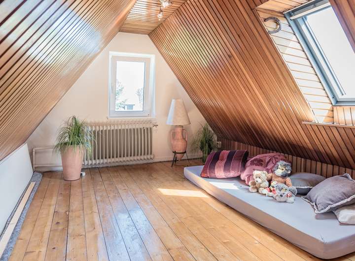 Ihr Bauunternehmer kann sich gerne die Treppe einmal ansehen. Die würde sich nämlich über ein Facelift freuen. Ansonsten gibt es hier oben gar nix zu meckern, und es gäbe tatsächlich auch noch einen ausgebauten Dachboden mit Heizung und Strom. Tolle helle 2-Zimmer Wohnung mit allem Zipp und Zapp. Jetzt ab in den Garten. Start- und Landebahnen satt für Vögel und Insekten aller Art. Da kann der Hamburger Flughafen einpacken. So, schon geschafft. Sie auch?