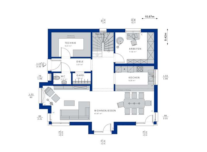 Die intelligente Grundrissgestaltung des EVOLUTION 165 bietet Ihnen fünf großzügige Zimmer, die sich auf zwei Etagen verteilen. Mit drei Schlafzimmern ist ausreichend Platz für die ganze Familie vorhanden, während das Badezimmer im Obergeschoss einen Rückzugsort für entspannende Momente schafft. Der offene Wohn- und Essbereich im Erdgeschoss ist das Herzstück des Hauses, wo Sie unvergessliche Familienmomente verbringen können. Hier haben Sie genügend Raum zum Spielen, Verweilen und Arbeiten, ohne dass es eng wird. Die Komfortdetails dieses Hauses sind ebenso beeindruckend. Genießen Sie die sonnigen Tage auf Ihrer eigenen Terrasse oder im Garten, die auf dem großzügigen Grundstück von 744 m² reichlich Platz zum Entspannen bietet. Die lichtdurchfluteten Räume schaffen eine einladende Atmosphäre und lassen Sie die Natur auch im Inneren Ihres Zuhauses spüren. Abstellräume sorgen für Ordnung und Stauraum, damit Sie Ihr Zuhause stets ordentlich halten können. Mit der Ausbaustufe "Schlüsselfertig" profitieren Sie von einem reibungslosen Bauablauf. Im Preis sind alle notwendigen Arbeiten bis zur finalen Fertigstellung enthalten, sodass Sie sich um nichts kümmern müssen. Wir garantieren Ihnen eine stressfreie Erfahrung beim Hausbau - einfach einziehen und wohlfühlen. So wird der Weg zu Ihrem neuen Zuhause so angenehm wie möglich gestaltet, und Sie können sich ganz auf die schönen Dinge im Leben konzentrieren.
