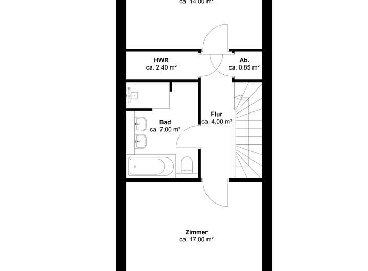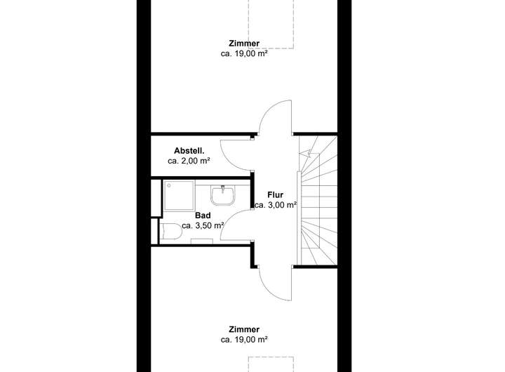 Das OG besteht aus 2 Schlafräumen, einem Bad (WC, Dusche, Badewanne, Doppelwaschbecken) ein HWR für Waschmaschine und Trockner und eine Abstellkammer.