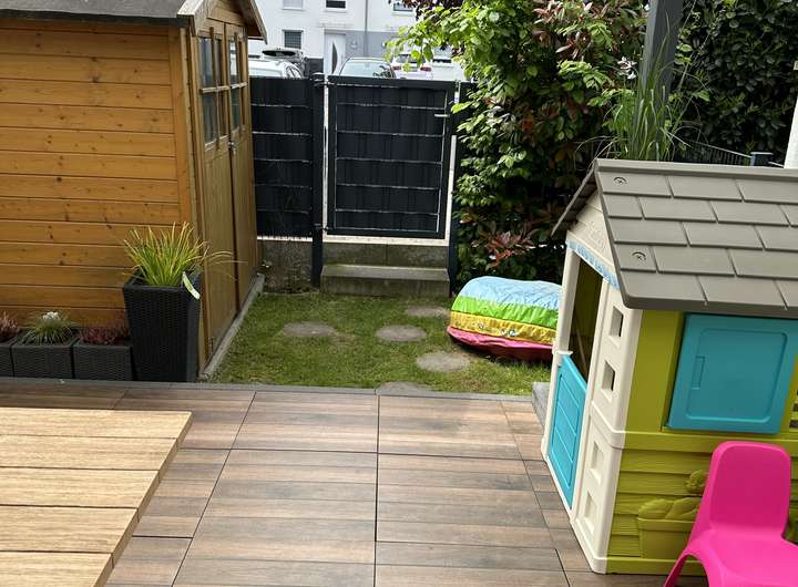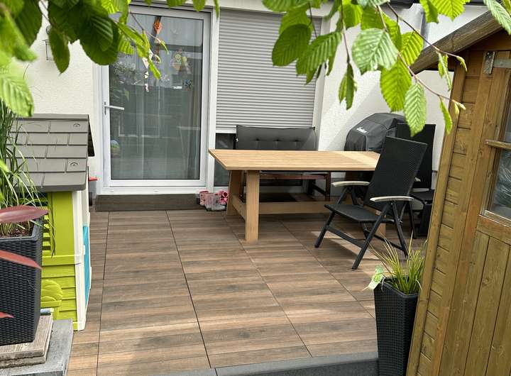 Im EG des Hauses befinden sich der Flur, Wohnzimmer, Küche, Gästetoilette (WC+Waschbecken) und eine Abstellkammer. Durch das Wohnzimmer kommt man auf die ca 16qm große überdachte (inkl. Unterdachmarkise) Terrasse, wo sich durch den kleinen Garten die Parkplätze leicht erreichen lassen.