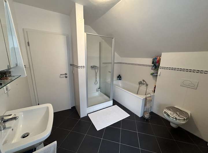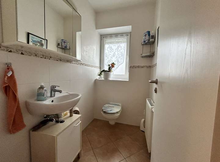 - Effiziente Fußbodenheizung im Wannen- und Duschbad im Obergeschoss und Gas-Zentralheizung