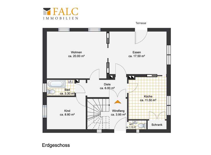 Beim Betreten des Hauses finden Sie einen einladenden Eingangsbereich mit einem wirklich großzügigem Treppenhaus. Über den Flur betreten Sie den herrlichen Wohn-Essbereich, welcher mittels einer Schiebetür getrennt werden kann. Vom Essbereich gelangen Sie in die angrenzende Küche. Die großen Fenster sorgen für viel Tageslicht und schaffen eine angenehme Wohnatmosphäre. Eine Terrasse bietet zusätzlichen Raum für ein Sonnenfrühstück oder gesellige Abende.