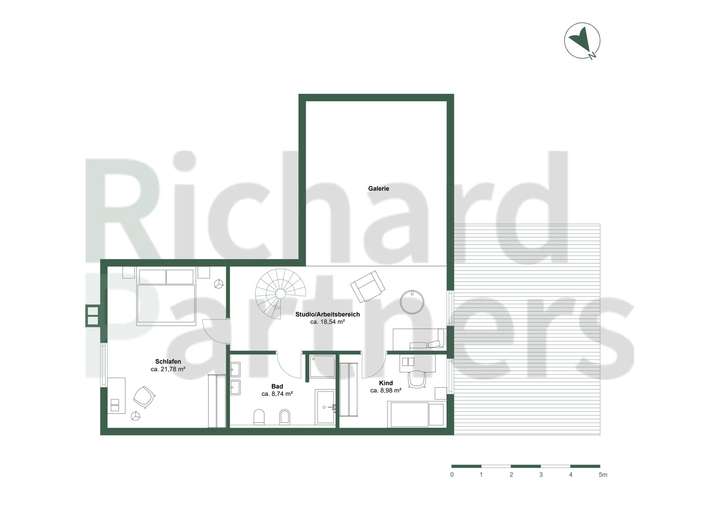 Das Dachgeschoss bietet ein offenes Studio, ein Schlafzimmer mit Holz-Deckenelementen, ein modernes Tageslichtbad mit Eckbadewanne und Dusche sowie ein weiteres Zimmer. Ein gedämmter Spitzboden steht zusätzlich als Stauraum zur Verfügung. Das Dach eignet sich ideal für PV- und Solarthermieanlagen.