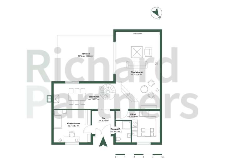 Ein heller italienischer Marmorboden zieht sich durch das gesamte Haus. Vom Flur aus erreichen Sie ein Büro (auch als Gäste- oder Kinderzimmer nutzbar) sowie das modernisierte Gäste-WC. Herzstück ist der lichtdurchflutete Wohn-Essbereich mit eleganter Wendeltreppe, offenem Übergang zur Küche und großer Fensterfront zur ca. 30 m² großen Terrasse.