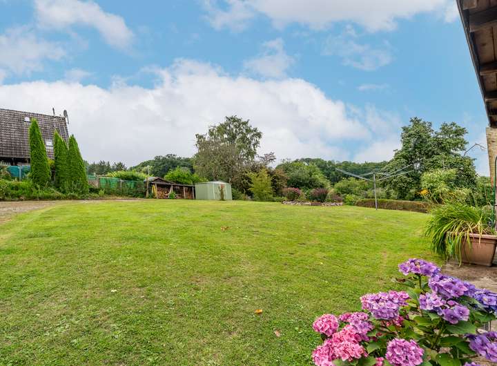 Der Charme des Hauses zeigt sich auch im Außenbereich. Eine Terrasse mit kürzlich neu errichtetem Dach lädt zu entspannten Stunden im Freien ein, während der weitläufige Garten mit seiner waldnahen Lage außergewöhnliche Privatsphäre garantiert. Hier finden sich zahlreiche Extras wie ein Gartenhaus, ein Unterstand sowie ein unter Bestandsschutz stehender Hühnerstall. Das Grundstück ist über ein Tor erschlossen und bietet damit Sicherheit und Freiraum zugleich – ideal auch für Tierhaltung.