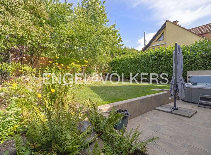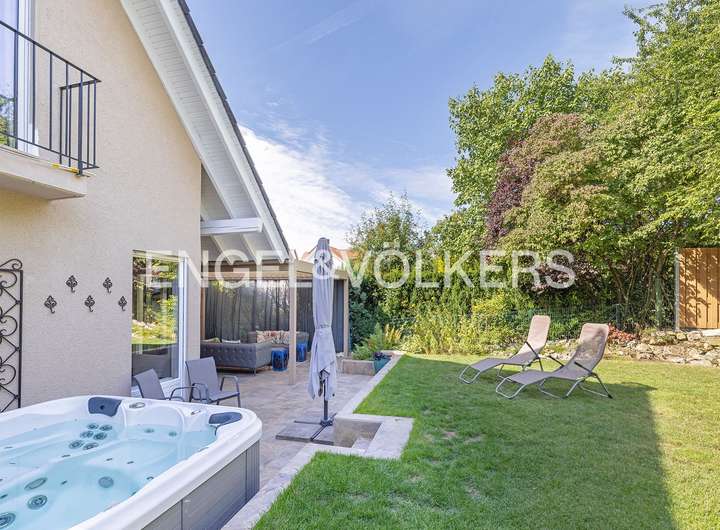 Der separat nutzbare Einliegerbereich im Souterrain mit kleiner Terrasse bietet einen zusätzlichen Raum für eine offene Küche, ein geräumiges Schlaf- oder Arbeitszimmer und ein modernes Duschbad. Ein besonderes Highlight sind die großzügigen, teilweise überdachten Terrassen auf zwei Ebenen und der gepflegte Garten mit Westausrichtung, der direkt an die grünen Wiesen und Taunuswälder angrenzt. Diese Lage schafft zusammen mit dem offenen und grünen Ausblick eine einzigartige Atmosphäre. Ein privater Jacuzzi bietet Entspannung pur und vervollständigt das Wellness-Erlebnis.