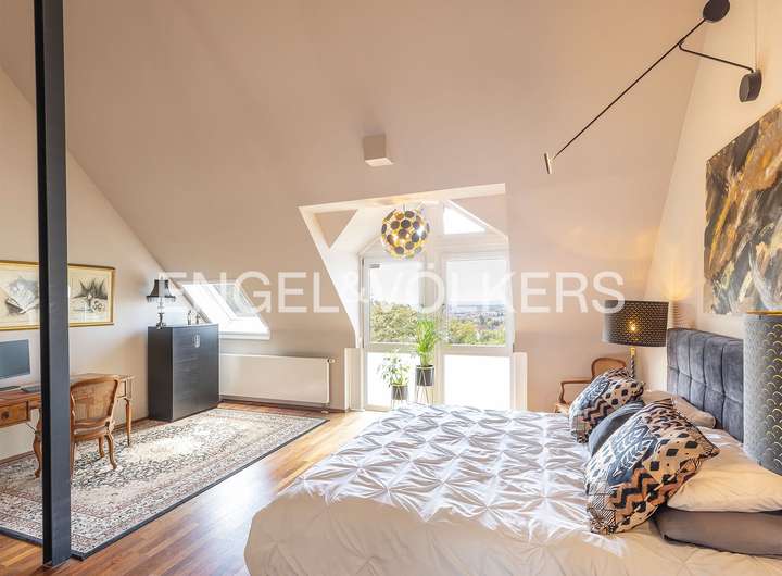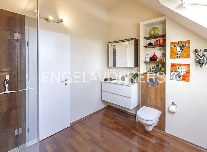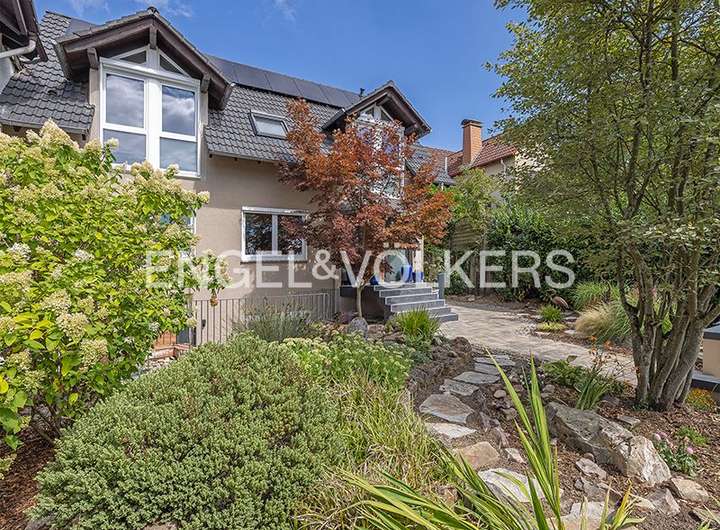 Schon beim Betreten des Hauses werden Sie von einem großzügigen, offenen Wohn- und Essbereich mit einer zeitgemäßen, hochwertig ausgestatteten Küche empfangen. Hier finden Familie und Freunde zusammen und genießen geselliges Beisammensein. Insgesamt bietet das Haus im Erdgeschoss und den oberen Ebenen fünf optimal geschnittene Räume, davon drei gut dimensionierte Schlafzimmer und zwei hochwertig ausgestattete Tageslicht-Bäder. Der üppige zweite Wohnbereich wird durch einen stilvollen Kamin akzentuiert, während hochwertige Parkettböden ein Gefühl von Wärme und Eleganz vermitteln. Beeindruckend ist der weitläufige, bis in den Giebel offene Masterbereich mit Panoramablick über die Main-Ebene bis nach Frankfurt. Dieses Konzept im Masterbereich bietet Platz für einen Schreibtisch, eine großzügige Ankleide sowie ein semi-offen gestaltetes Wellness-Bad mit Waschtisch, Walk-in-Dusche und großer Wanne. Zwei helle und gut dimensionierte Zimmer und ein Duschbad bieten bieten sich als Schlaf- oder Arbeitszimmer.