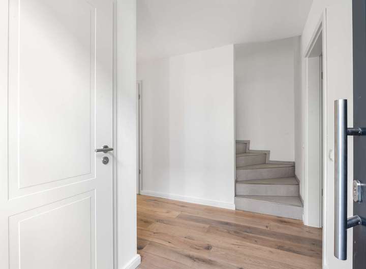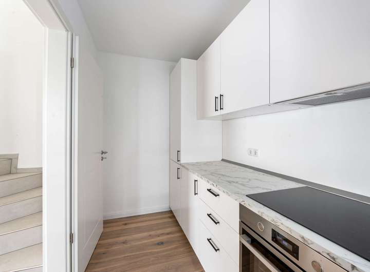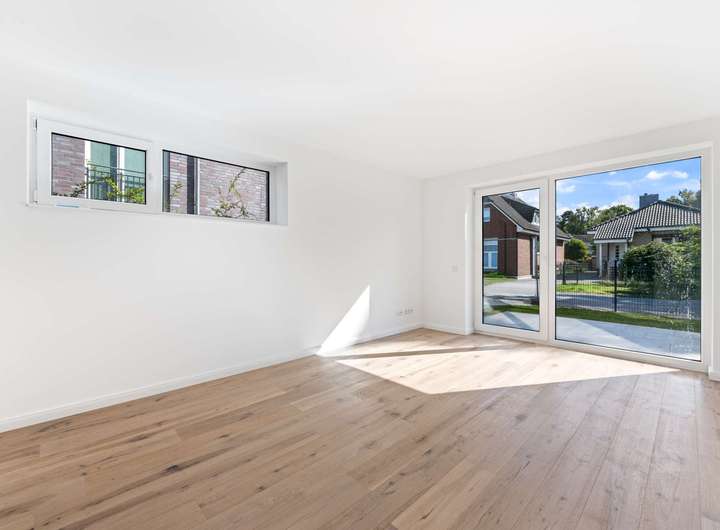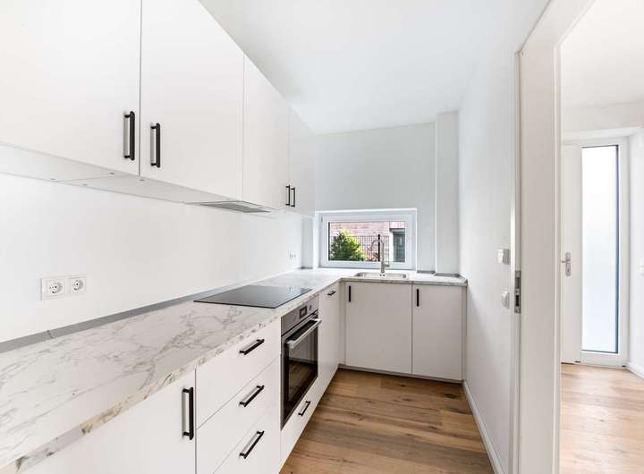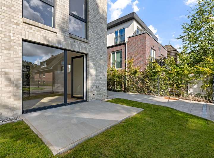 Im Erdgeschoss erwartet Sie ein lichtdurchfluteter Wohn- und Essbereich mit offenem Zugang zur Terrasse und dem privaten Gartenanteil mit einer Größe von ca. 22 m2 – ideal für entspannte Stunden im Grünen. Die separate Einbauküche in elegantem Weiß ist bereits installiert und wartet darauf, belebt zu werden. Ergänzt wird die Etage durch ein praktisches Gäste-WC mit Tageslicht.