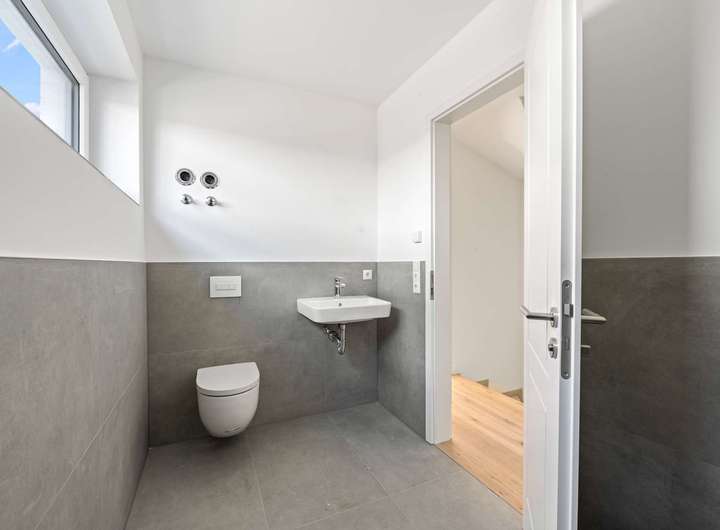 Über die solide Betontreppe gelangen Sie ins Obergeschoss, das den privaten Rückzugsbereich beherbergt: Hier finden Sie zwei helle Schlafzimmer mit großen Fenstern sowie ein stilvolles Vollbad mit bodengleicher Dusche.