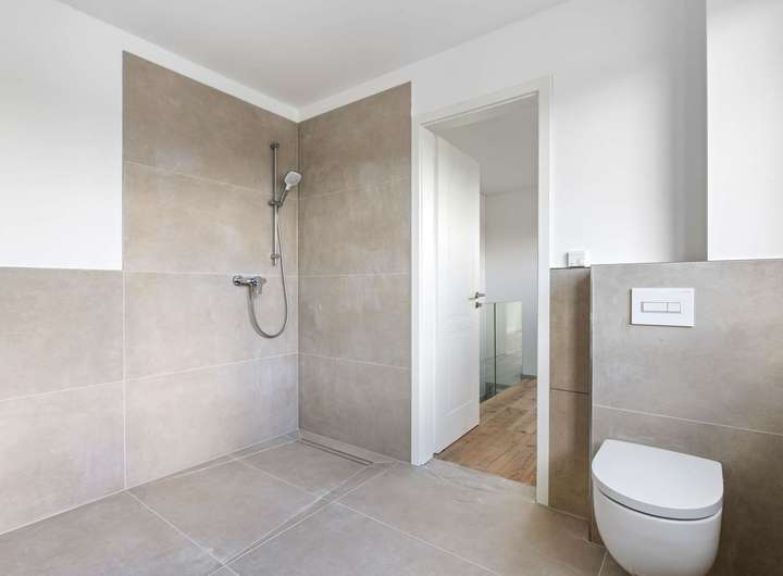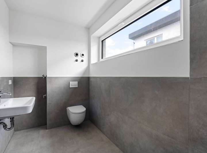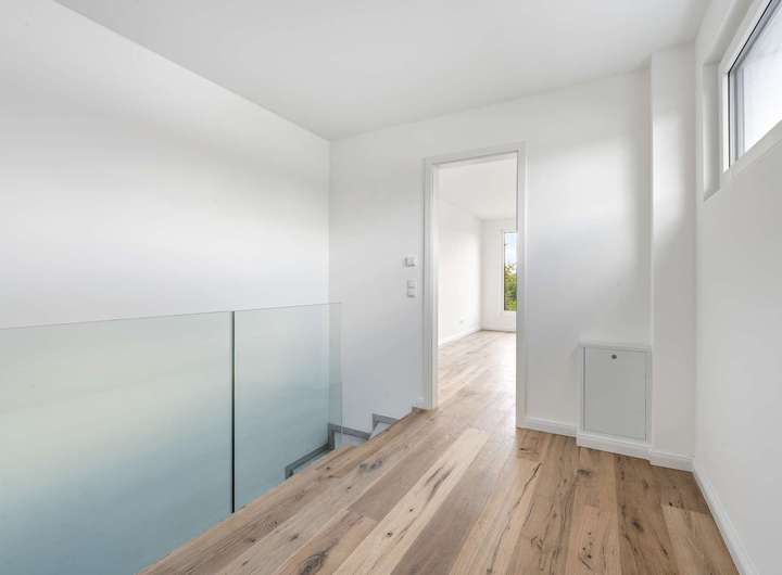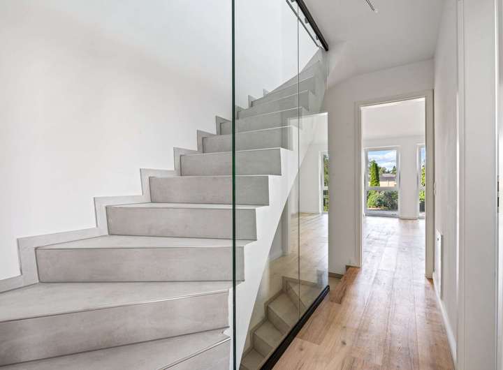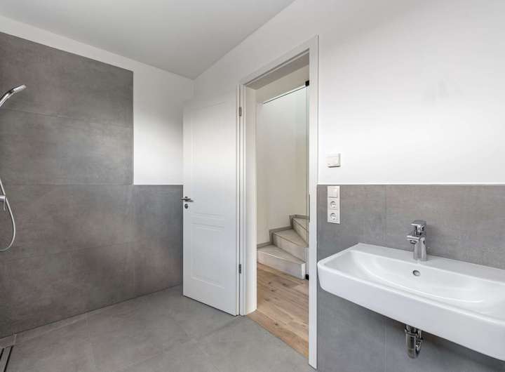 Über die solide Betontreppe gelangen Sie ins Obergeschoss, das den privaten Rückzugsbereich beherbergt: Hier finden Sie zwei helle Schlafzimmer mit großen Fenstern sowie ein stilvolles Vollbad mit bodengleicher Dusche.
