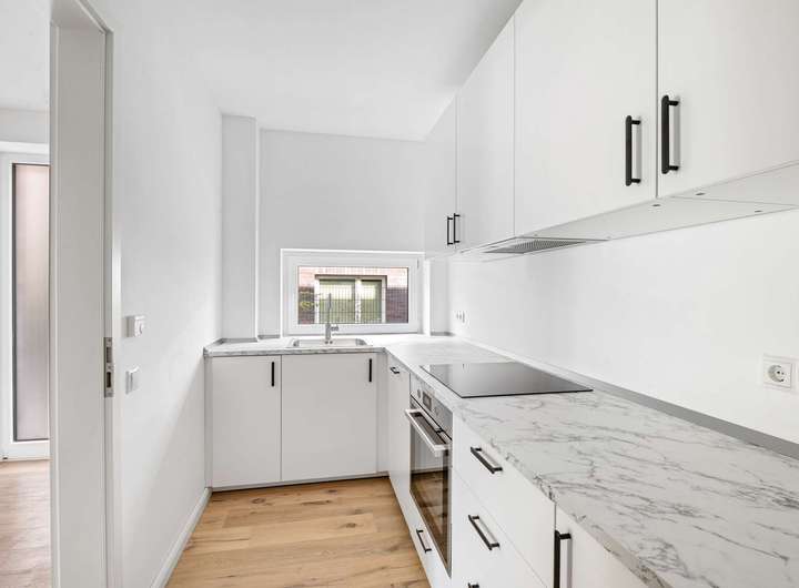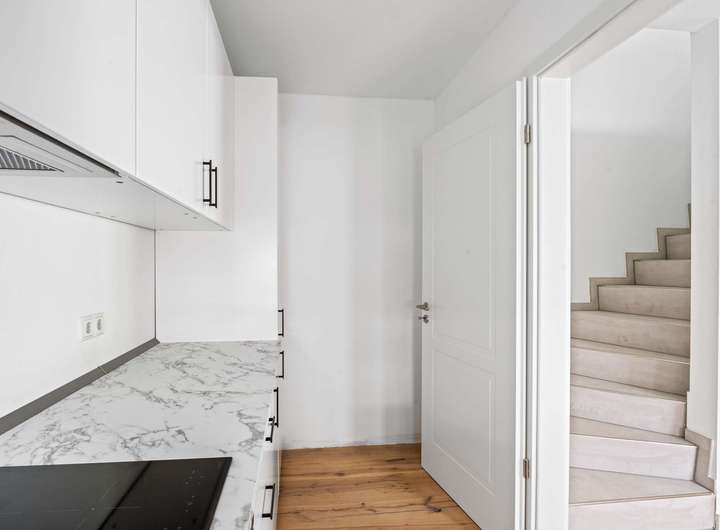 Im Erdgeschoss erwartet Sie ein lichtdurchfluteter Wohn- und Essbereich mit offenem Zugang zur Terrasse und dem privaten Gartenanteil mit einer Größe von ca. 73 m2 – ideal für entspannte Stunden im Grünen. Die separate Einbauküche in elegantem Weiß ist bereits installiert und wartet darauf, belebt zu werden. Ergänzt wird die Etage durch ein praktisches Gäste-WC mit Tageslicht.