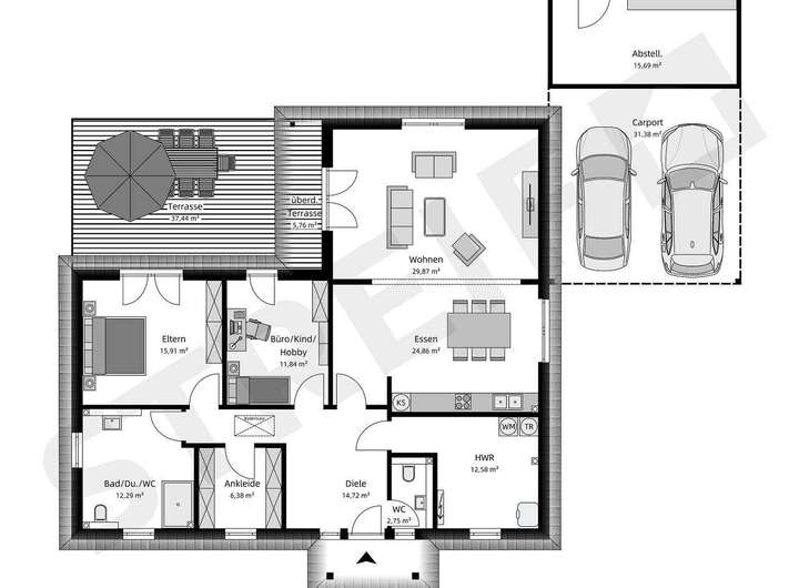 zzgl. Baunebenkosten, Außenanlage und Ausstattung für den Innenausbau, gemäß Ihren Wünschen.