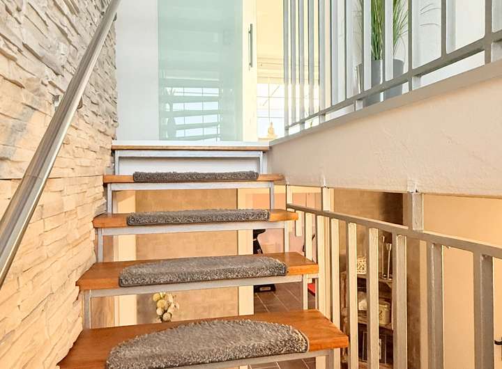 AUSSTATTUNG Wohnzimmer/Küche: ca. 52m² • Offene, geräumige Küche • Einbauküche von Schöller • Natursteinwand • Hochwertiger Parador Vinyl-Boden • Schiebe-Glastür • Direkter Zugang zur oberen Terrasse • Innenliegende Sprossenfenster Ankleidezimmer: ca. 16m² • Hängesystem kann auf Wunsch übernommen werden Badezimmer: ca. 25m² • Freistehende Badewanne • XXL ebenerdige Dusche • Doppelwaschbecken • Großer LED-Touch-Spiegel Schlafzimmer: ca. 24m² • Velux Dachfenster • Angepasste Plissees Büro: ca. 24m² • Velux Dachfenster • Angepasste Plissees WC • 2024 erneuert • LED-Touch-Spiegel • Velux Fenster • Direkte Nähe zum Schlafz. Flur • Vom Keller bis zum Dachboden Natursteinwand am Treppenaufgang Keller (teils Wohnkeller): ca. 100m² • Ca. 25m² Partyraum inkl. Bar • Ca. 25m² Fitnessraum inkl. Geräte • Vorratsraum / Abstellraum • Waschraum • Heizungsraum • Teils Designerbelag Nutzungsst. 64 Garten: ca. 930m² • 2 großzügige Terassen • Gerätehäuschen • Garage + Carport • Pool 4,60m x 1,20m – 2019 Neu • Komplett mit Stabmattenzaun 2018 neu umzäunt • Gästehaus Renovierungsarbeiten / Neuerungen • Bad komplett erneuert 2012 • WC komplett erneuert 2024 • Dachgeschoss Velux Fenster Herbst 2018 • Gas Heizung 2018 neu • Carport / Überdachung Terrasse 2018 • Terrasseneinfassung Glas 2018 • Hof + Auffahrt neu gepflastert 2018 • Terrasse Gästehaus 2018 • Garage Sektionaltor 2018 • Stabmattenzaun 2018 • Pool 2019 • Fassade Gästehaus 2019 • Gästehaus Innen erneuert 2018 • Dachsanierung 2023 • Außenjalosien im EG 2021 • PV Anlage 2024 • Treppe außen Eigangsbereich erneuert (Granitstein) 2024