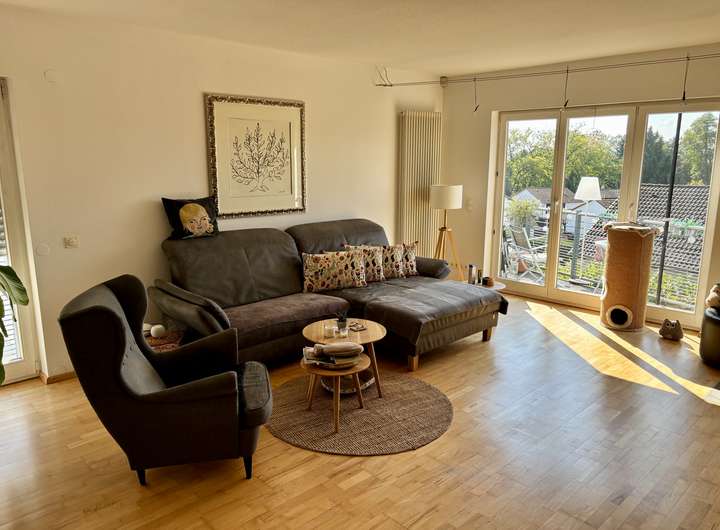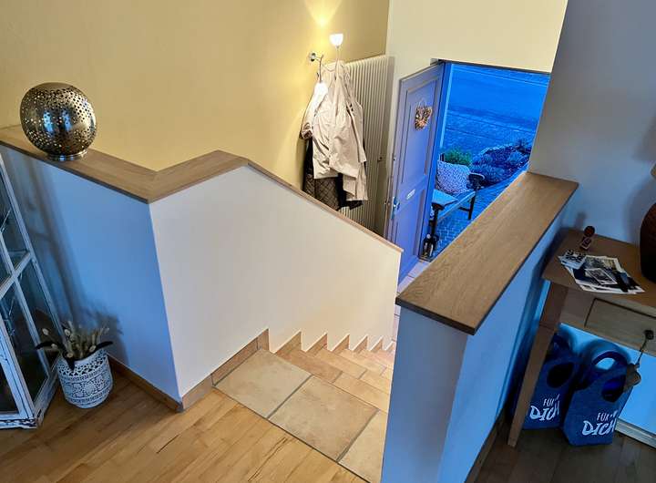 Echtholzparkett und hochwertige Fliesenböden, bodentiefe Fenster auf beiden Etagen zum Garten hin, ein zusätzlicher Balkon im Wohnzimmer, Kaminofen von Hase mit dem man die gesamte obere Etage beheizen kann