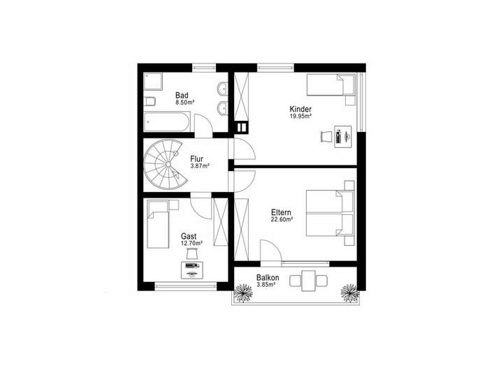 Im Obergeschoss erwarten Sie ein großzügiges Schlafzimmer, zwei weitere Zimmer für Kinder oder Gäste, ein Flur sowie ein tageslichtdurchflutetes Badezimmer mit Badewanne und Dusche. Vom Elternschlafzimmer aus haben Sie direkten Zugang zum weitläufigen, nach Westen ausgerichteten Balkon.