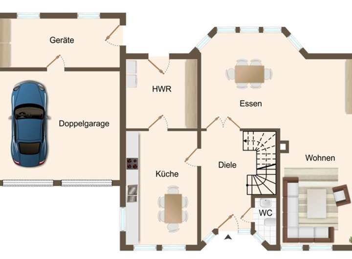 Das Grundstück mit 1.580 m² bietet viel Platz für Familie, Gartenfreunde oder Freizeitgestaltung. Fünf Garagenstellplätze runden das Platzangebot ideal ab.