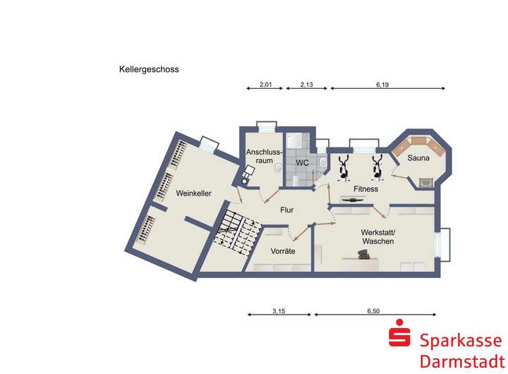 Der Kellerbereich bietet Platz für die Heizungsanlage, einen Weinkeller, einen Vorratsraum, eine geräumige Waschküche und einen Wellnessbereich mit Sauna mitsamt dazugehörigem Duschbad und WC.