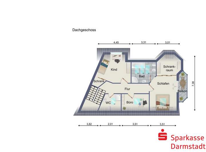 Im Dachgeschoss finden sich insgesamt drei Schlafzimmer und ein Tageslichtduschbad mit WC. Das größere Schlafzimmer verfügt über ein helles en suite Tageslichtwannenbad mit zusätzlicher Dusche und WC sowie Zugang auf einen nach Westen ausgerichteten Balkon.