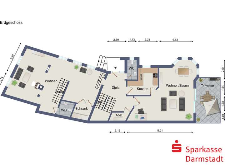 Die Diele im Erdgeschoss teilt sich in ein Gäste-WC, einen Abstellraum, die Küche und ein großzügiges Wohn-/Esszimmer mit Zugang auf eine nach Westen ausgerichtete Terrasse sowie in den großen Garten. Von der Diele begeht man zudem das Vorderhaus mit einem großen Kaminzimmer samt weiterem Gäste-WC.