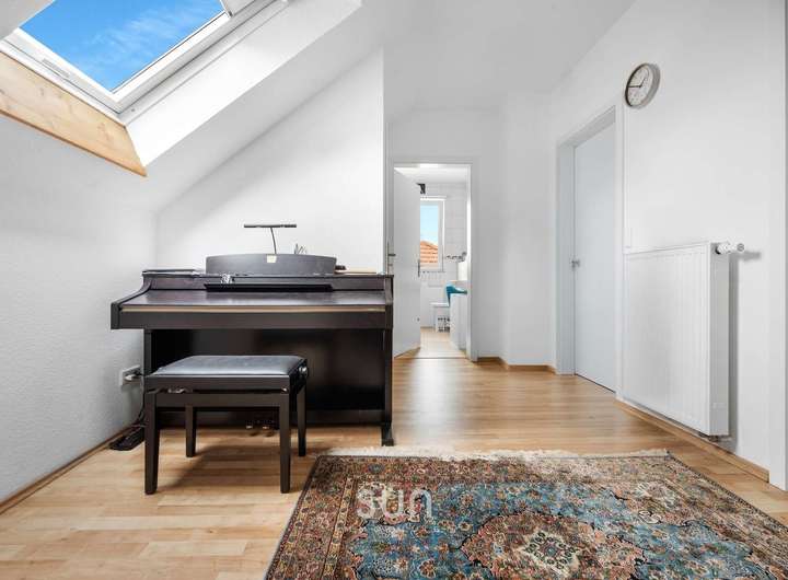 Fünf helle Zimmer auf drei Etagen bieten vielfältige Nutzung – ob als Kinderzimmer, Homeoffice oder Rückzugsort. Zwei Tageslichtbäder, ein Gäste-WC und praktische Abstellflächen sorgen für Struktur im Alltag.