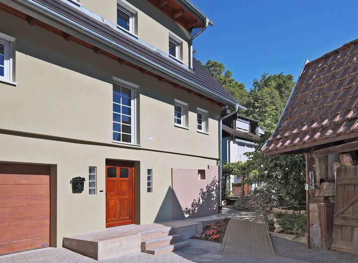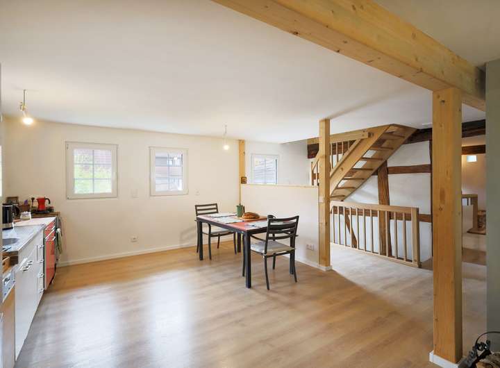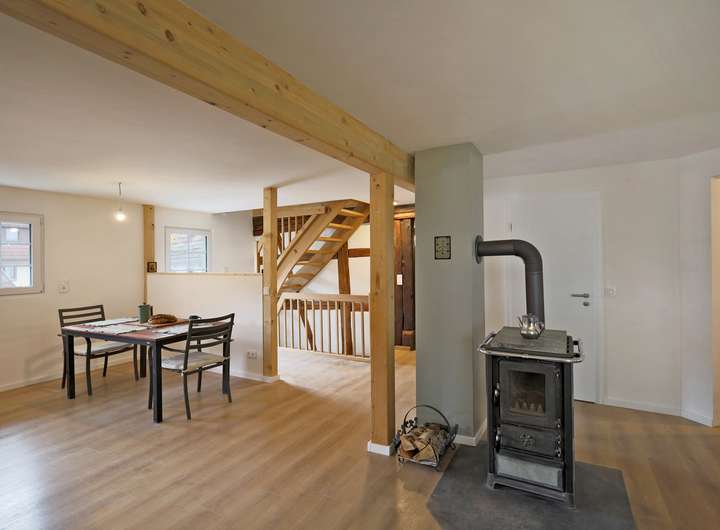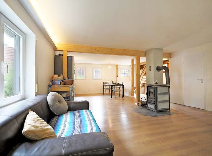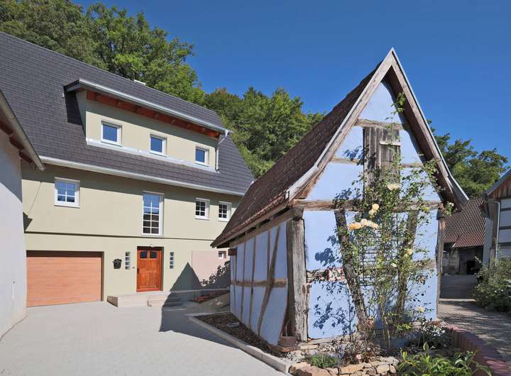 Inmitten einer idyllischen Kulisse, direkt am sanft plätschernden Grenzbach und in einer ruhigen, von der Straße zurückversetzten Sackgasse, offenbart sich ein außergewöhnliches Familiendomizil. Dieses charmante Fachwerkhaus aus dem Jahr 1807 verbindet seinen historischen Charakter auf einzigartige Weise mit den Annehmlichkeiten modernster Wohnkultur. Eine umfassende Kernsanierung in den Jahren 2023 bis 2025 schuf ein Zuhause, das höchsten Ansprüchen an Komfort und Energieeffizienz gerecht wird. Das Innere des Hauses wurde von Grund auf erneuert: Neue Wasser- und Elektroleitungen, dreifach verglaste Kunststofffenster sowie eine effiziente Luftwärmepumpe und ein gemütlicher Kamin sorgen für behagliches Wohnklima. Das Dach wurde samt tragender Balken und Isolierung komplett erneuert, während die Fassadendämmung und der neue Putz das historische Fachwerk gekonnt in Szene setzen. Die Gestaltung der Bäder und die Wahl hochwertiger Bodenbeläge (inkl. Fußbodenheizung im Masterbad und Badewanne mit Whirlpoolfunktion) unterstreichen den eleganten Gesamteindruck. Ein besonderes Merkmal ist der Außenaufzug, der einen barrierefreien Zugang in die obere Etage ermöglicht. Zudem bietet das großzügige Dachgeschoss viel Raum für individuelle Gestaltungsideen. Der liebevoll angelegte Garten, sowie eine uneinsehbare Terrasse laden dazu ein, die Ruhe und Privatsphäre dieses besonderen Ortes zu genießen. Ein geschichtsträchtiges kleines blaues Fachwerkhaus neben den Stellplätzen bietet zusätzlichen Stauraum und vielseitige Nutzungsmöglichkeiten. Diese Immobilie ist ein Rückzugsort, der eine harmonische Symbiose aus Tradition und Moderne darstellt und eine besondere Lebensqualität verspricht.
