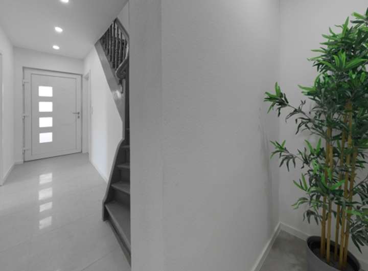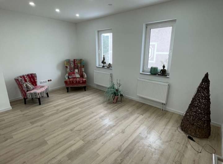Beim Betreten des Hauses empfängt Sie ein heller Flur, der direkt in das großzügige Wohnzimmer führt. Hier sorgen große Fenster für viel Tageslicht und eine angenehme Wohnatmosphäre. Die angrenzende Küche ist modern gestaltet und bietet ausreichend Platz für kulinarische Entfaltung.