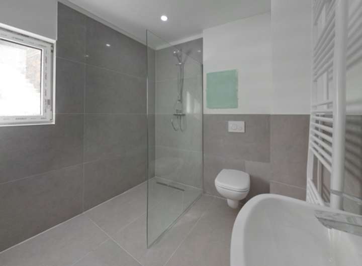 Zwei moderne Badezimmer, eines im Erdgeschoss und eines im Obergeschoss, sind mit hochwertigen Armaturen ausgestattet und bieten sowohl eine Dusche als auch eine Badewanne.