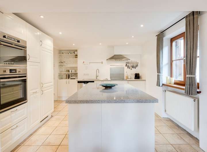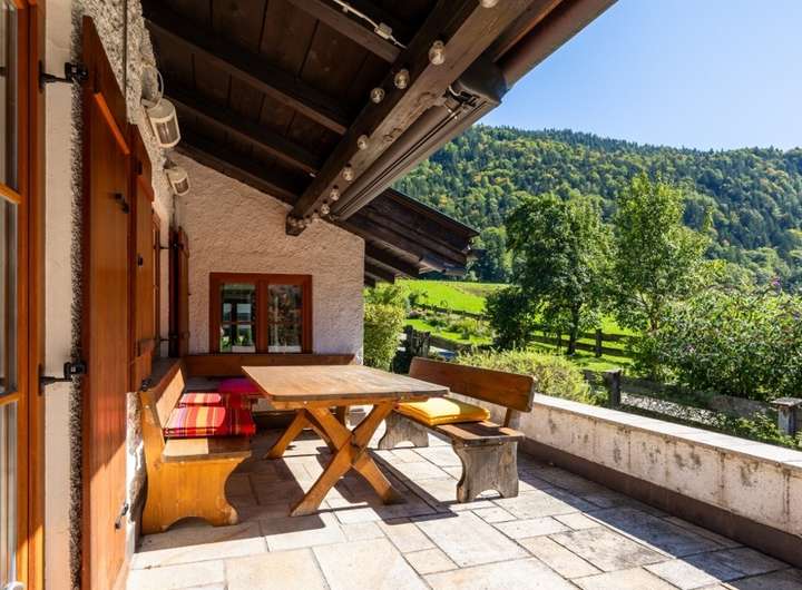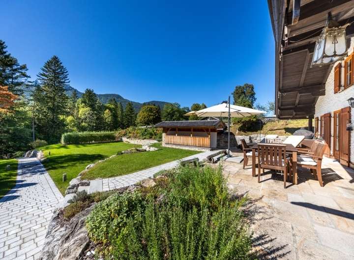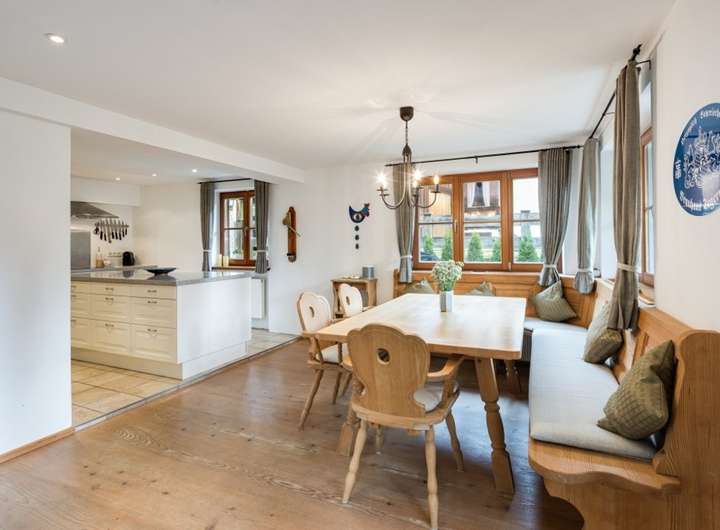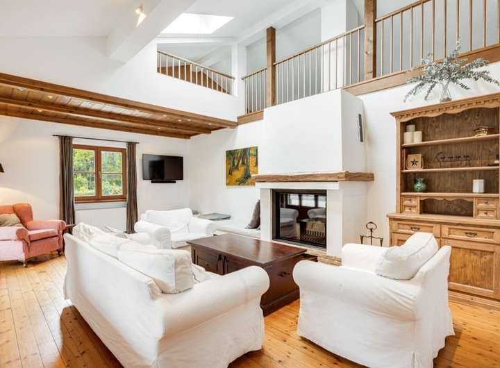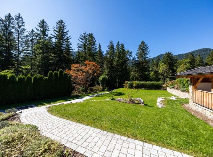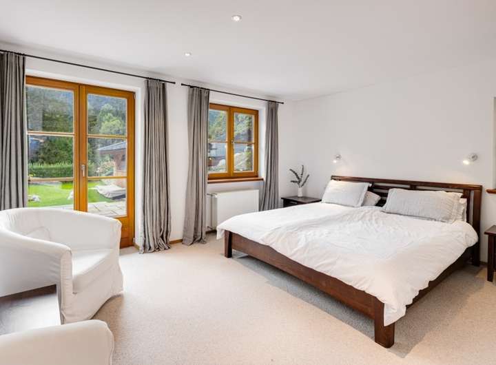Das helle und elegant eingerichtete Haus bietet höchsten Wohnkomfort: Zwei Schlafzimmer im Erdgeschoss mit En-Suite Bädern, ein weiteres Doppelzimmer im Obergeschoss mit eigenem Bad sowie eine großzügige Galerie für Erholung und Entspannung. Die traditionelle Stube verbindet sich harmonisch mit einer modernen, offenen Küche, während das geräumige Wohnzimmer mit offenem Kamin zum gemütlichen Beisammensein einlädt. Große Fenster und Terrassentüren schaffen eine fließende Verbindung zwischen Innen- und Außenbereichen. Die weitläufigen Terrassen und der liebevoll angelegte Garten bieten einen traumhaften Blick ins Grüne und auf die umliegenden Berge.