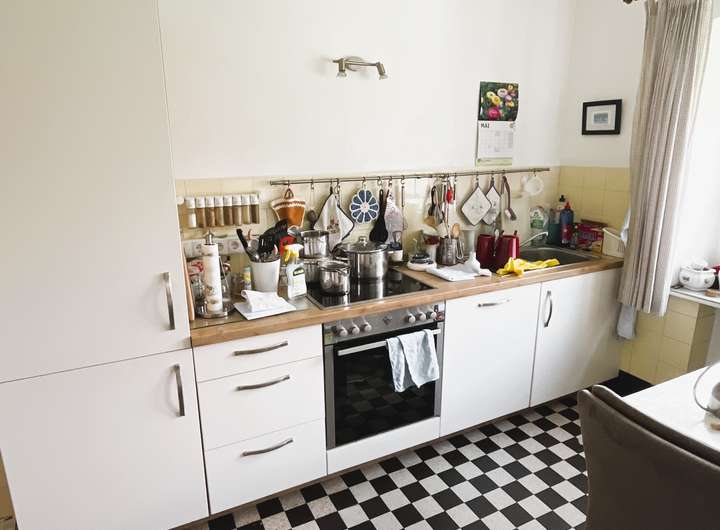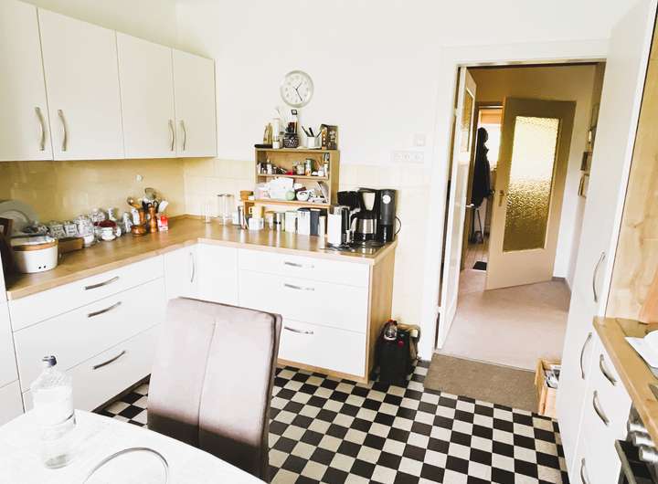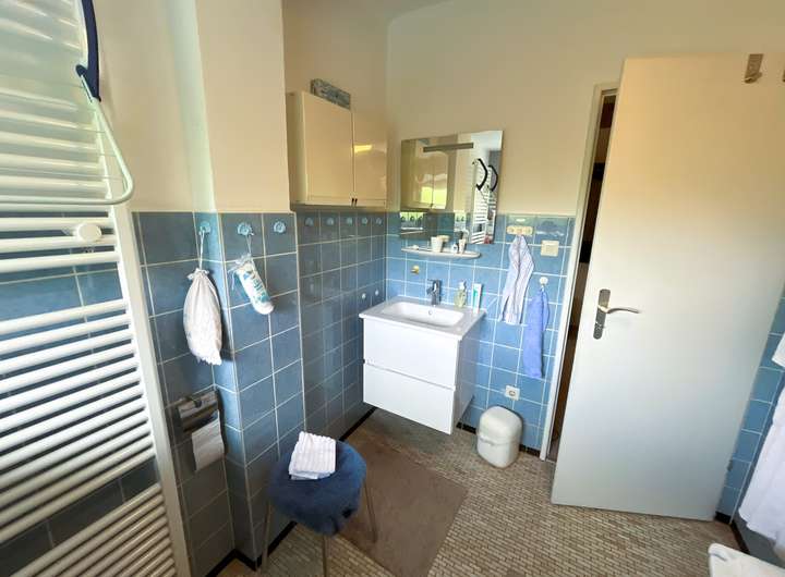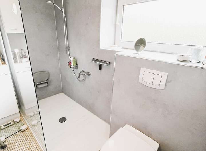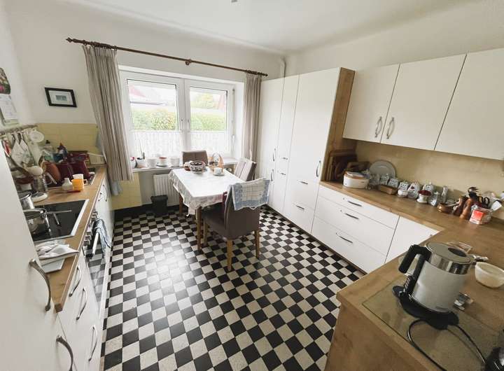 Die modernisierte Küche im Erdgeschoss ist funktional und stilvoll gestaltet. Auch das Badezimmer auf dieser Etage wurde zeitgemäß erneuert und mit einer komfortablen, bodennahen Dusche ausgestattet.