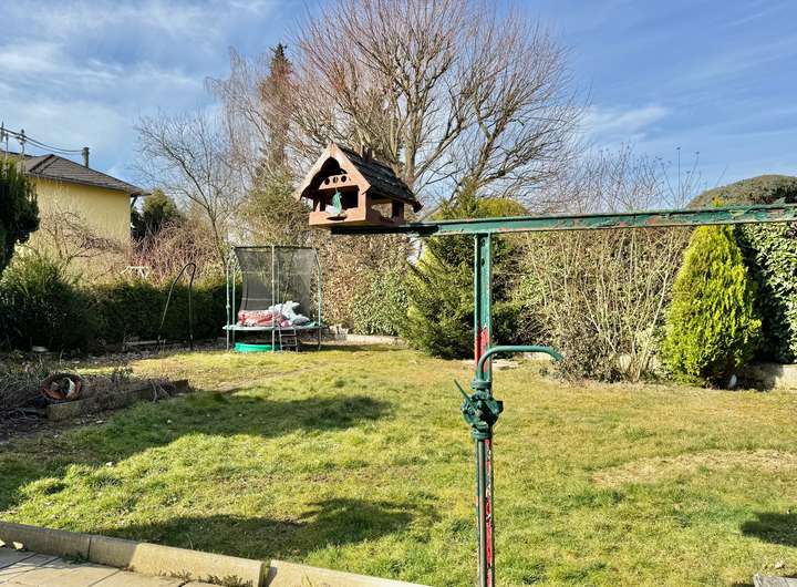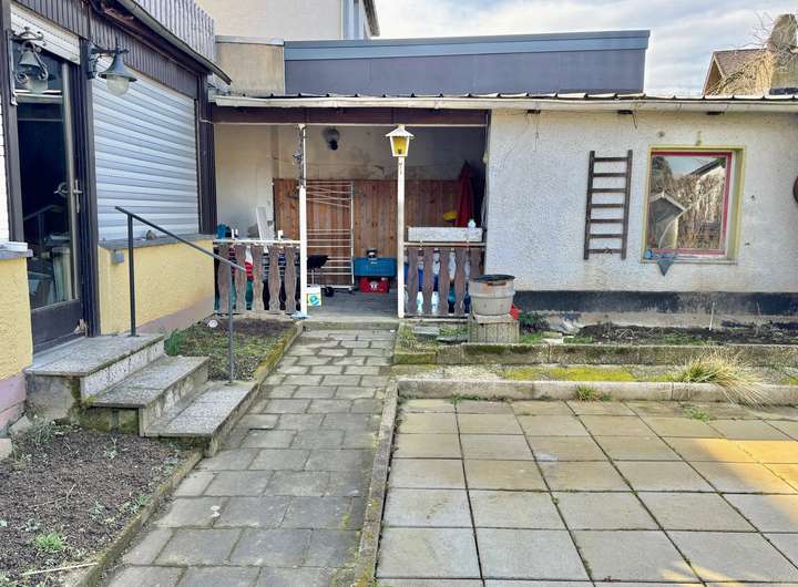 Im Außenbereich vorne befinden sich die Garage und ein Vorbeet, das auch zu einem weiteren Stellplatz umgewidmet werden könnte sowie der Hofeingang. Der hintere Grundstücksbereich ist aufgegliedert in eine Terrasse mit einem Nebengebäude (Schuppen) sowie einer Rasenfläche.
